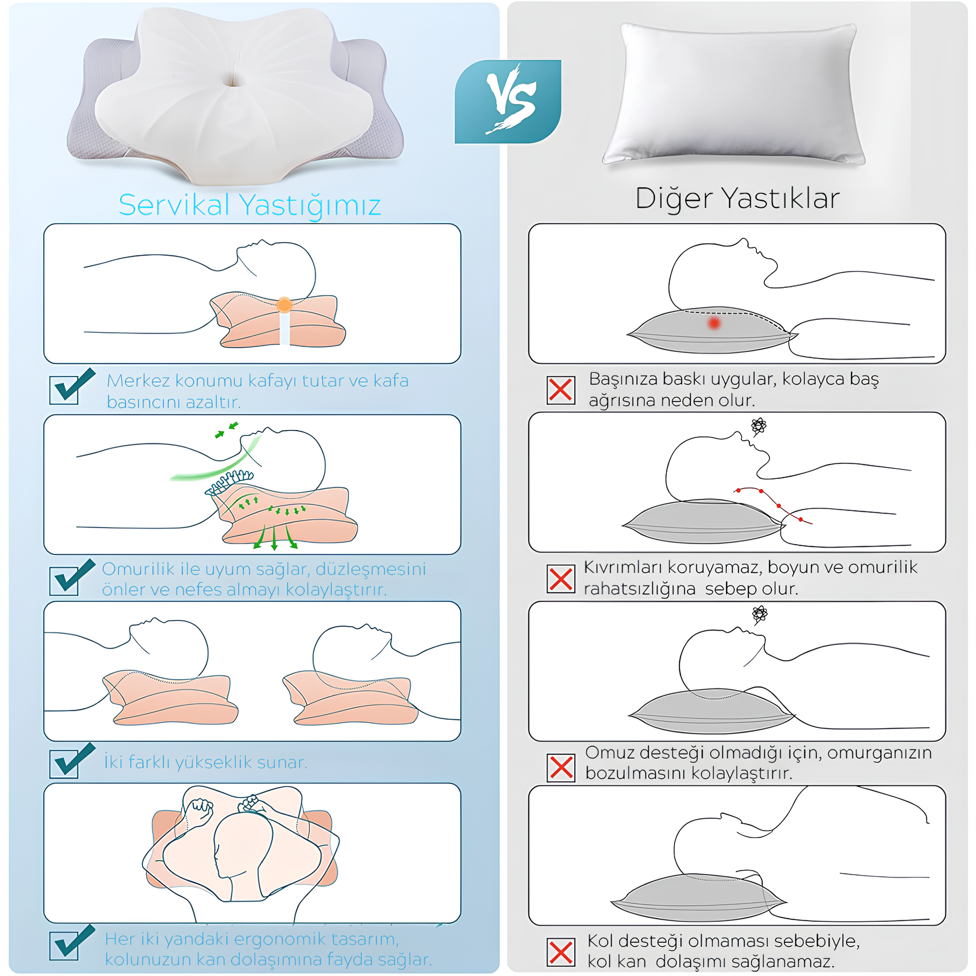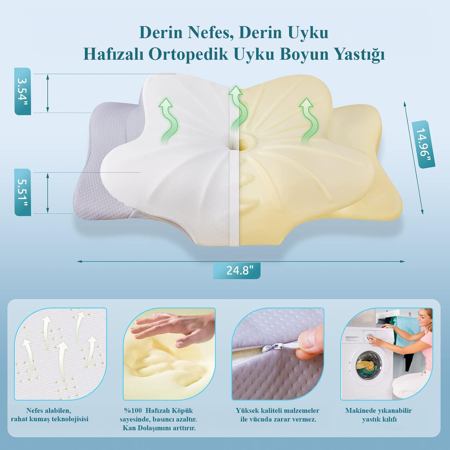 Boynunuzun doğal eğrisini destekleyen ergonomik tasarımı ile mükemmel rahatlık sağlar. Boyun ağrılarını azaltarak daha derin ve kesintisiz bir uyku deneyimi sunar. Sizi uyandıran ağrılara veda edin, her sabah dinç ve enerjik bir şekilde uyanın!